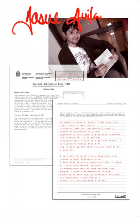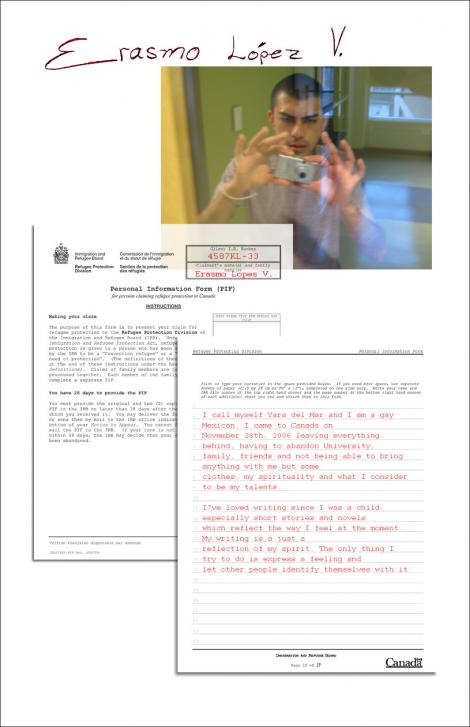 The youth artists of this exhibit have been in Canada for anywhere from three months to five years. What they have in common is a shared experience of being forced to leave their homes (Turkey, Pakistan and Mexico) as a result of persecution based on their sexual preference. Most of them are still waiting for a final decision from Citizenship and Immigration Canada to know if they will be staying, and if they will be permitted to make a "new beginning" in Canada. Each of these artists have grappled with a Personal Information Form or the difficult questions of an immigration officer: “but how can you prove to me that you are gay?” This process is especially precarious for claimants given that Canadian immigration officers have no guidelines or training on sexual orientation. This project is a way to give these youth a voice outside of the immigration office or the Personal Information Form.