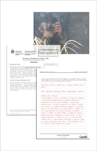 The youth artists of this exhibit have been in Canada for anywhere from three months to five years. What they have in common is a shared experience of being forced to leave their homes (Turkey, Pakistan and Mexico) as a result of persecution based on their sexual preference. Most of them are still waiting for a final decision from Citizenship and Immigration Canada to know if they will be staying, and if they will be permitted to make a "new beginning" in Canada. Each of these artists have grappled with a Personal Information Form or the difficult questions of an immigration officer: “but how can you prove to me that you are gay?” This process is especially precarious for claimants given that Canadian immigration officers have no guidelines or training on sexual orientation. This project is a way to give these youth a voice outside of the immigration office or the Personal Information Form.